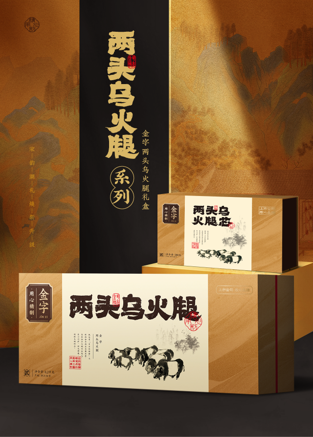 四大火腿系列:留香系列、陳香系列、典藏系列、兩頭烏系列,各自美麗又相輔相成。留香系列采用宋朝的天下第一色:紅色,喜慶、炙熱、勇猛;陳香系列采用宋鈞紅釉的朱色,低調、穩重、靜謐;典藏系列和兩頭烏系列采用冷色調:黑色、棕色,端莊、素雅、歸真。